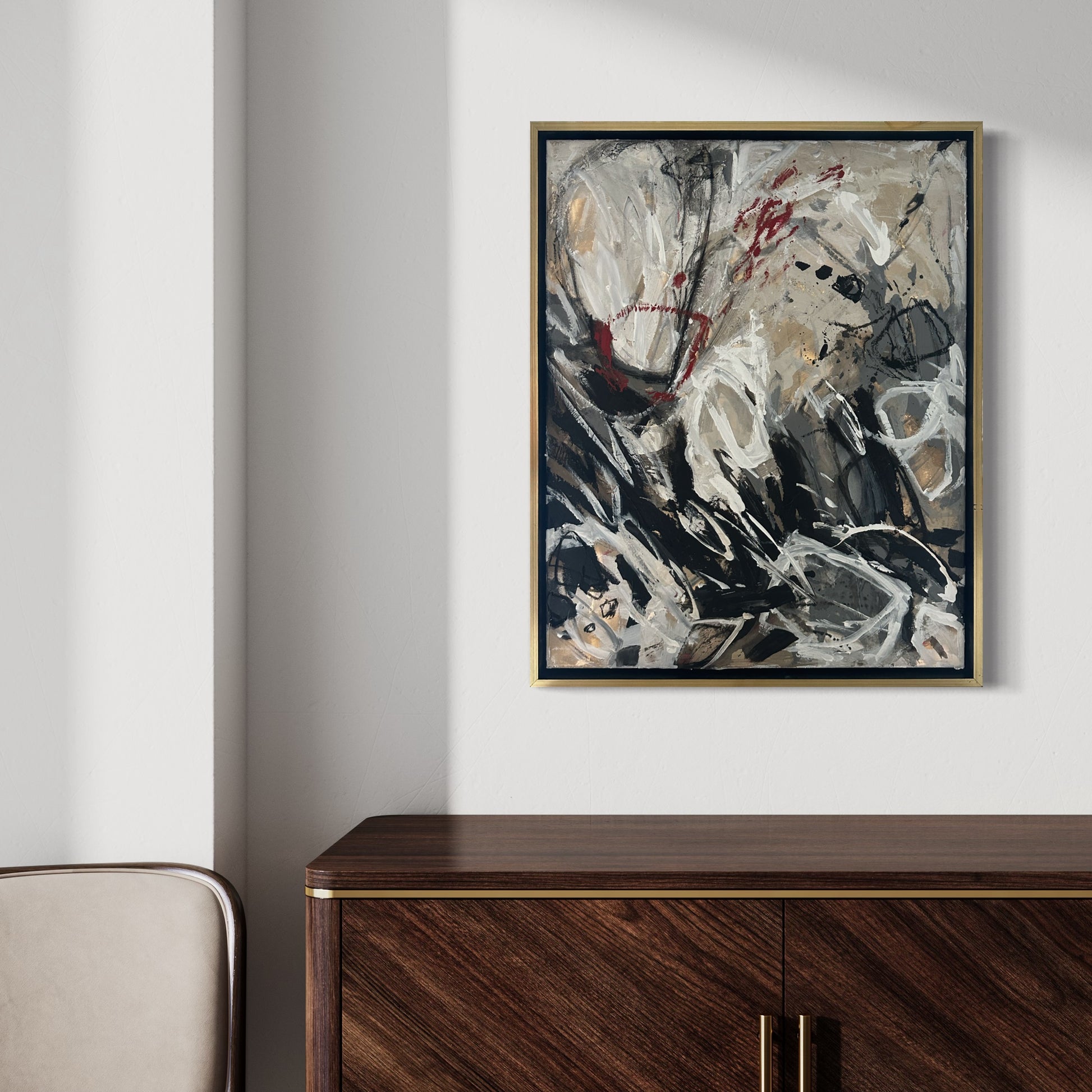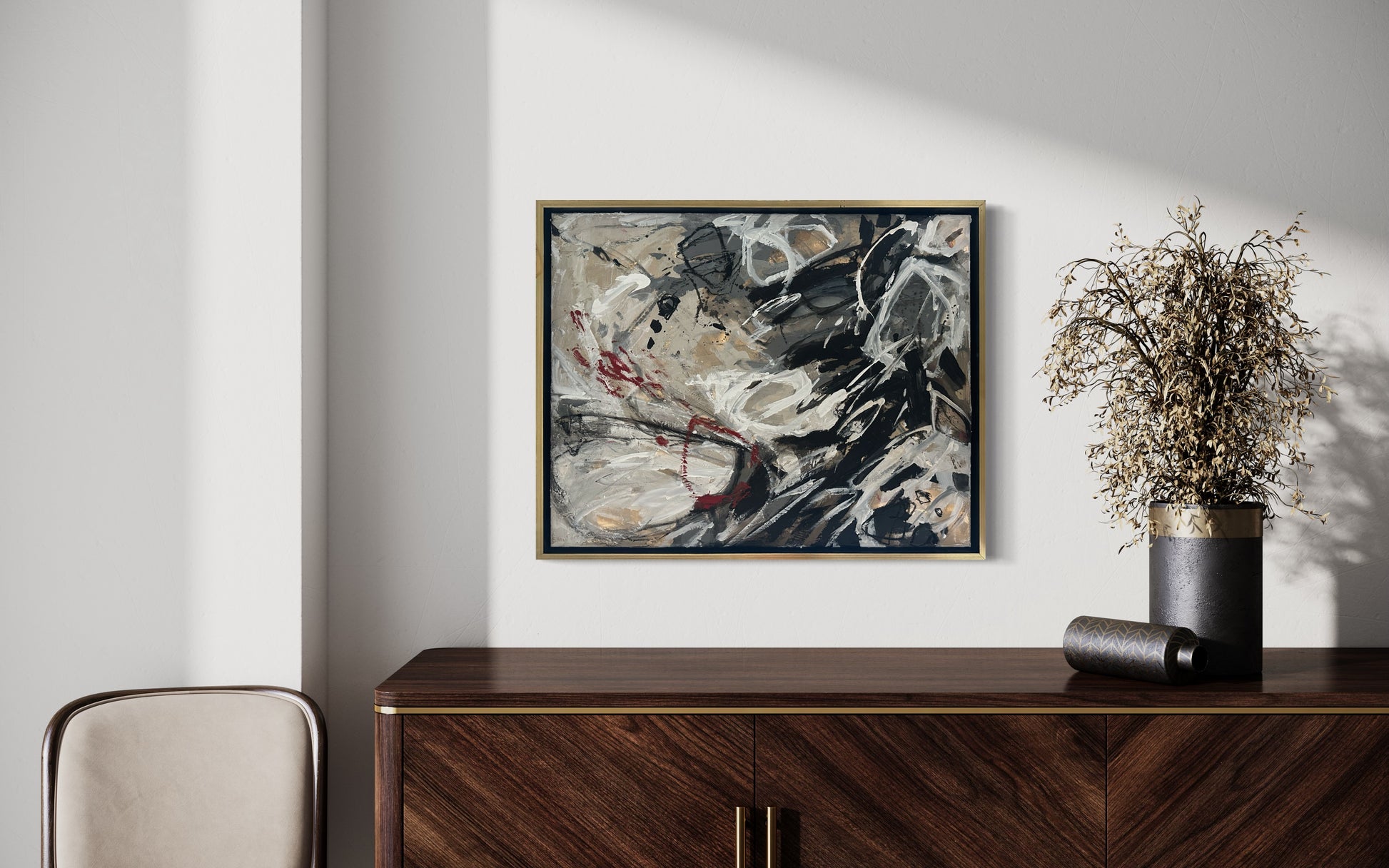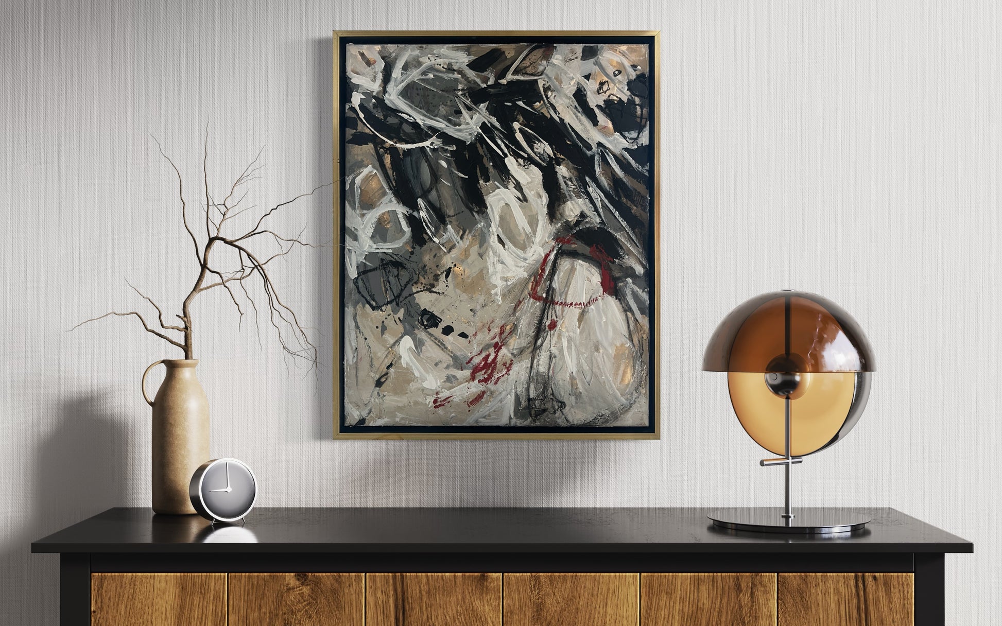 24x30” Mixed Media on Canvas. Black and Gold Floater Frame.