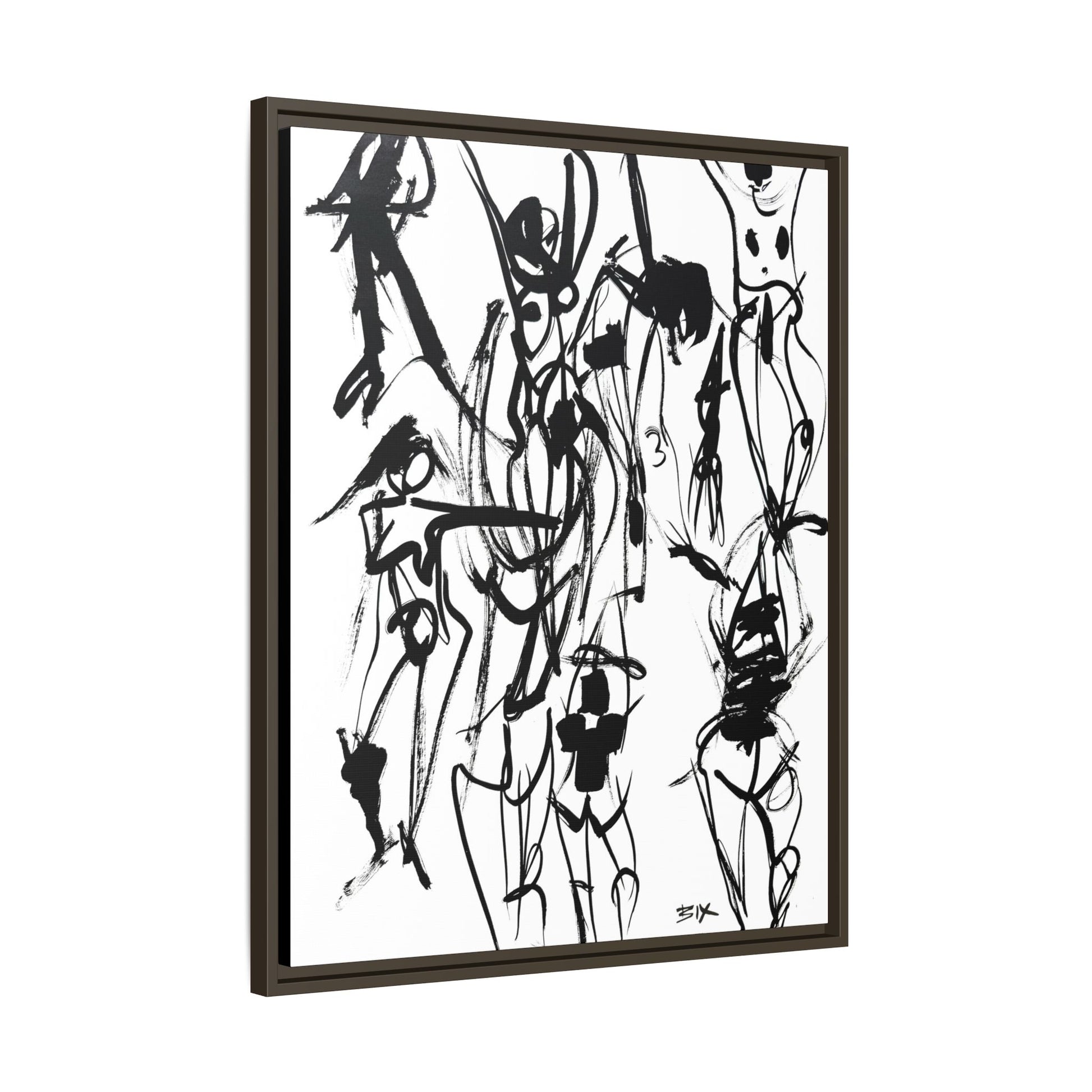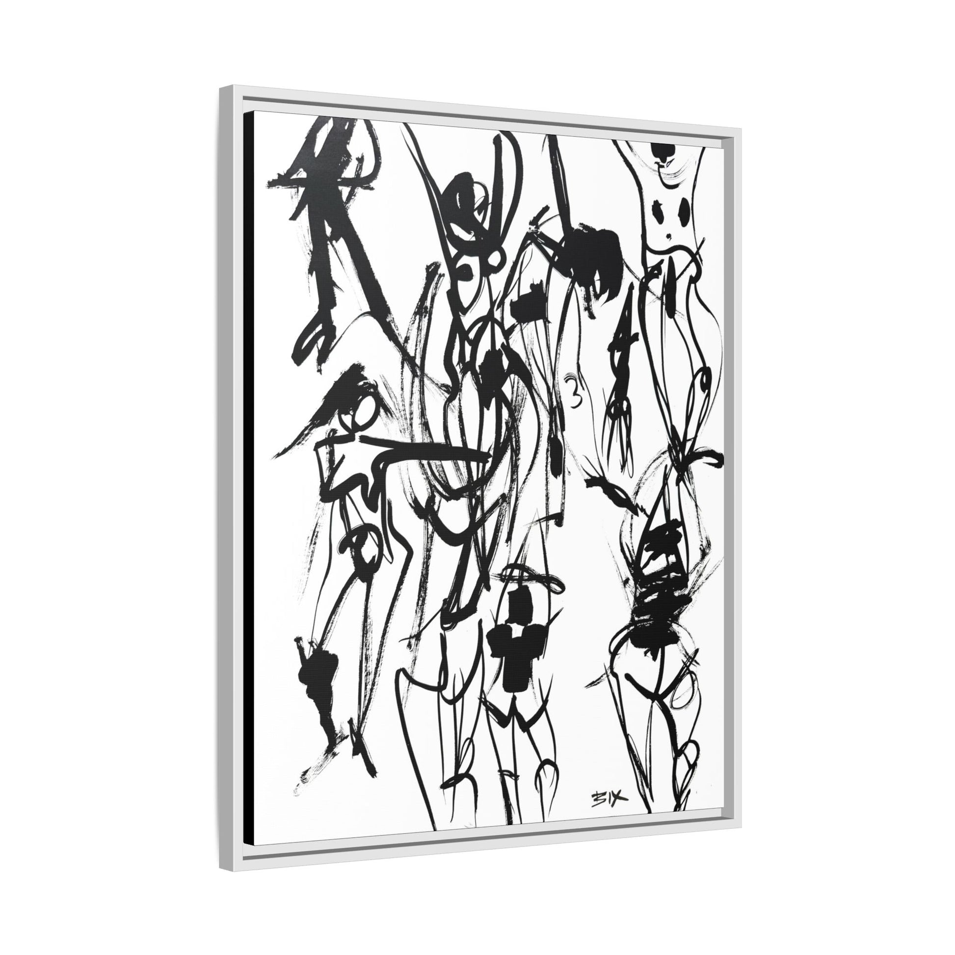 Gestural figurative sketch poses on a matte canvas, framed in multi-color. This unique and sustainable canvas print offers vibrant colors and is printed with non-hazardous latex inks. Perfect for art lovers looking to add a touch of creativity to their space.
